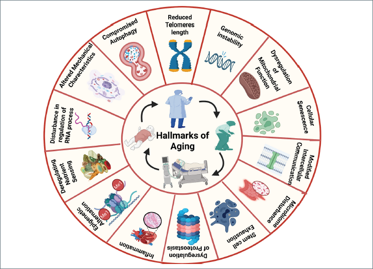 Figure 1.Hallmarks of aging.Illustration of major aging hallmarks, including telomere shortening, genomic instability, mitochondrial dysfunction, senescence, altered intercellular communication, stem cell exhaustion, proteostasis loss, inflammation, epigenetic changes, deregulated nutrient sensing, RNA processing defects, mechanical alterations, and impaired autophagy.