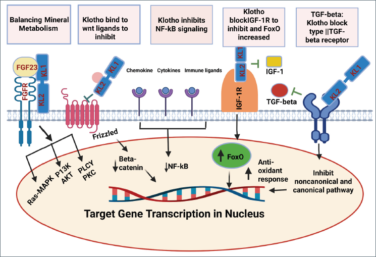 The Klotho protein plays a crucial role in modulating multiple signaling pathways that govern aging, mineral metabolism, oxidative stress, and inflammation as shown in Figure 3.