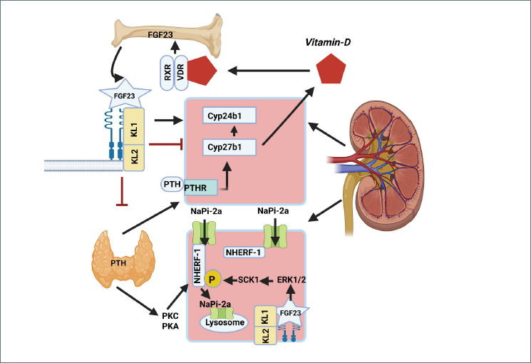 Figure 4.Klotho-FGF23-PTH-vitamin D axis in phosphate homeostasis. FGF23, via Klotho-FGFR, suppresses renal Cyp27b1 and stimulates Cyp24b1, reducing active vitamin D, while downregulating NaPi-2a transporters. PTH promotes phosphate excretion by NHERF-1 phosphorylation and NaPi-2a internalization.