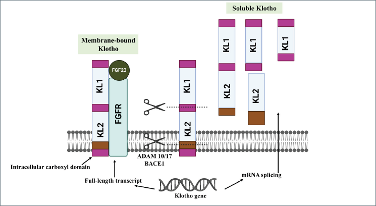 Figure 2.Membrane-bound and soluble forms of Klotho.The Klotho gene produces a full-length transcript encoding membrane-bound Klotho, which complexes with fibroblast growth factor receptor (FGFR) to mediate FGF23 signaling. Ectodomain shedding by ADAM10/17 or BACE1 releases soluble Klotho (containing KL1 and/or KL2 domains) into circulation. Alternatively, mRNA splicing generates a secreted form lacking the transmembrane domain.