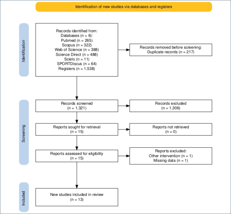 The databases searched were MEDLINE (via PubMed, n = 265), Scopus (n = 322), Web of Science (n = 388), ScienceDirect (n = 488), SciELO (n = 11), and SPORTDiscus (n = 64), totaling 1,538 publications. After applying the selection criteria, 13 randomized controlled trials (RCTs) were included in this systematic review (Figure 1). However, only 10 studies were included in the forest plot analysis. This is because six studies reported outcomes for either balance or muscle strength, but not both.