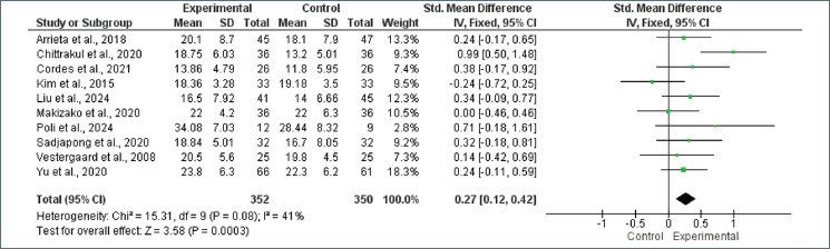 In Figure 3 a total of n = 10 studies were included in the analysis. The observed standardized mean differences ranged from -0.24 to 0.99, with the majority of estimates being positive (80%). The estimated average standardized mean difference based on the random-effects model was 0.27 (95% CI: 0.12 to 0.42). Therefore, the average outcome differed significantly from zero (z = 3.58, p = 0.0003). The Q-test for heterogeneity was not significant, but some heterogeneity may still be present in the true outcomes (I2 = 41%).