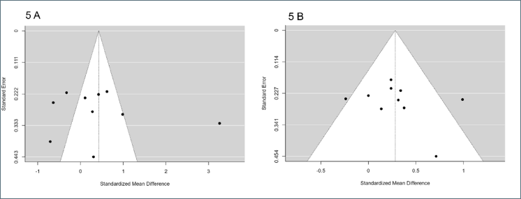 In Figure 5A (Balance), neither the rank correlation nor the regression test indicated any funnel plot asymmetry (p = 0.73 and p = 0.78, respectively). In Figure 5B (Strenght), neither the rank correlation nor the regression test indicated any funnel plot asymmetry (p = 0.38 and p = 0.42, respectively).