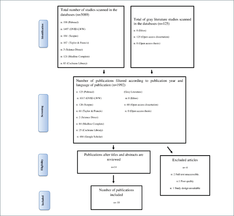 Key words were used in the first part of the literature scan. A total of ten electronic databases were searched for English and Turkish publications published in 2012-2022, three of which were identified as gray literature. The number of publications found in the scan of the databases was 3089 + 125 (gray literature). After filtering according to language and year of publication, the total number of studies was 1992. These studies were reviewed according to their titles and abstracts and 14 full texts with suitable study designs were systematically organized using the Mendeley reference management program. The number of cases studied in the randomized controlled trials (RCTs) and interventional research was limited (Tab. II). After a quality analysis, 10 studies on the incidence of skin problems, their severity and healing and the parameters of the physiological functions of the skin were included in the systematic review (Fig. 1). Additionally, five of these studies were randomized controlled studies, one was experimental research, and four were quasi-experimental studies. The total number of cases in the 10 articles amounted to 1148. The various characteristics of the studies can be found in Table V.